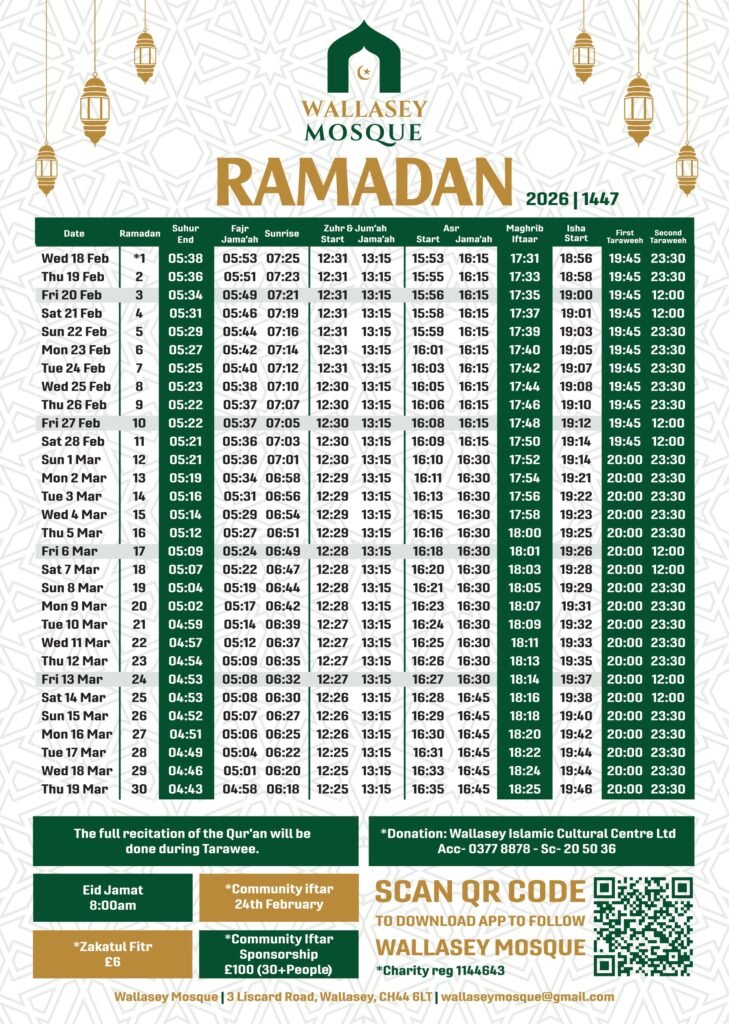 This Ramadan 2026 timetable from Wallasey Mosque provides accurate daily prayer and fasting times to help the community observe the holy month with ease and devotion. From Suhur and Fajr to Maghrib and Isha, including Jummah and Taraweeh timings, the schedule ensures worshippers can plan their day around prayer, reflection, and spiritual growth. With community iftars, Taraweeh prayers, and important reminders included, this calendar serves as a complete guide to making the most of Ramadan in unity, gratitude, and faith.